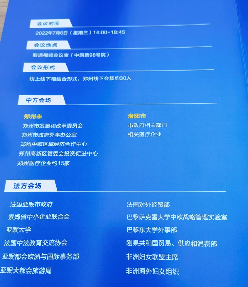 7月4日,中法《第二屆ACESF大健康科學(xué)家論壇》視頻會議開幕式舉行。鄭州市何雄市長在鄭州市會場致辭,亞眠大都會區(qū)主席阿蘭·蓋斯特以視頻連線形式致辭。河南路通國際經(jīng)貿(mào)集團公司衛(wèi)總被邀參加并做主旨演講。